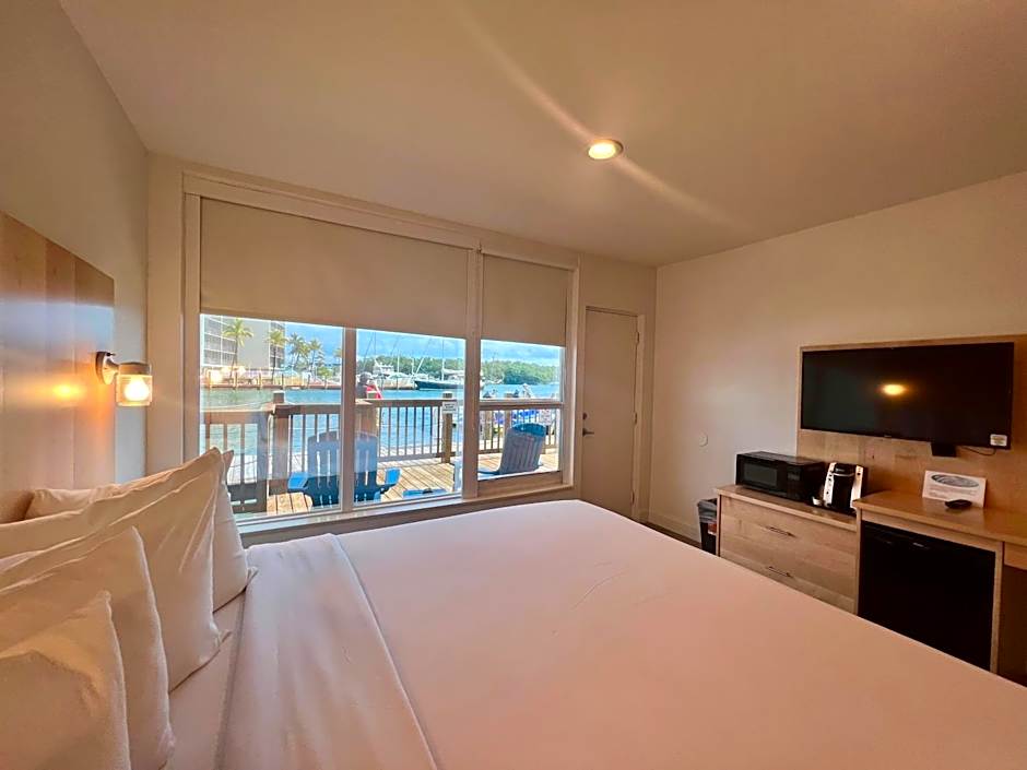 This waterfront, ground floor room features a small refrigerator and a dockside patio.